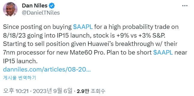 월스트리트저널(WSJ)이 "중국 정부가 공무원들에게 아이폰을 비롯해 외국 브랜드 제품을 공무 중 사용하지 말도록 지시했다"라고 보도한 탓입니다. 중국 시장 수요에 대한 우려가 커졌죠. 또 유럽연합(EU)이 우월적 시장 지위 남용을 막기 위해 내년에 시행되는 디지털 시장법(DMA) 규제 대상으로 애플과 알파벳, 마이크로소프트, 메타, 아마존, 중국의 바이트댄스 등 6개를 지정했다는 소식도 부정적이었습니다. 사토리 펀드의 댄 나일스 설립자는 "지난달 18일 아이폰15 출시를 앞두고 높은 확률로 애플이 오를 것이라고 보고 매수한 뒤 주가가 9%(S&P500 지수는 3% 상승) 올랐다. 이제 매도 포지션을 취한다. 중국 화웨이가 7나노 프로세서를 갖춘 획기적인 메이트60프로를 출시한 데 따른 것이다. 아이폰15 출시가 가까워지면 매도를 계획하라"라고 밝혔습니다. 그는 지난달 20일 "단기적으로 애플 주식은 과매도 되었다. 아이폰 신제품 출시를 둘러싼 역사적 선례를 볼 때 좋은 단기 트레이드 대상이 되어야 한다고 생각한다"라고 밝힌 바 있습니다.