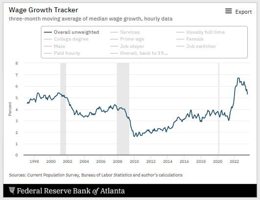 애틀랜타 연방은행이 집계하는 임금 추적기(wage tracker)는 오늘 지난 8월 임금 인상률을 5.3%로 추정했습니다. 7월 5.7%에서 추가 둔화된 것입니다. 2022년 1월 이후 최저치입니다. 여전히 제롬 파월 의장이 원하는 3.5% 수준보다는 높지만 고무적이지요.