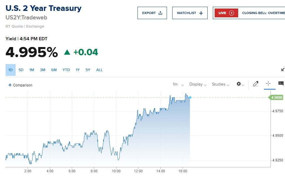 뉴욕 채권시장에서 아침에 소폭 하락하던 금리는 만하임 지수 발표 이후부터 상승세를 보였습니다. 오후 5시께 2년물 수익률은 4bp 오른 4.991%를 기록했고, 10년물은 0.2bp 상승한 4.264%로 거래되었습니다. 오르긴 했지만, 그 폭은 미미했습니다.