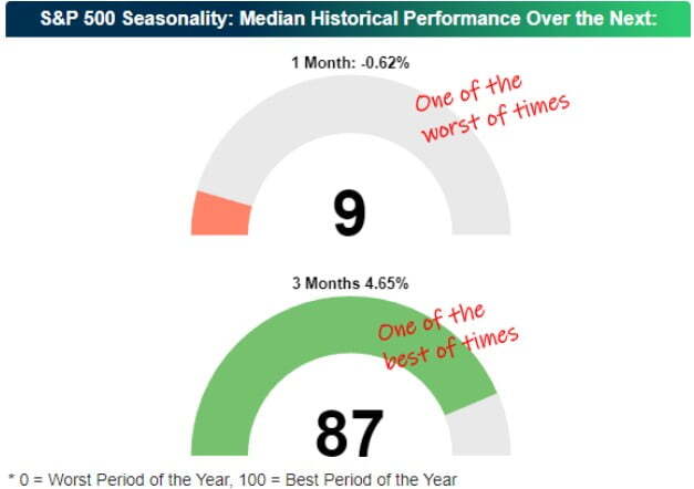 9월은 주식 시장에게 힘든 달입니다. 베스포크 인베스트먼트는 "지난 10년을 보면 9월 8일 주식 시장이 마감한 뒤 1개월 동안 S&P500 지수는 0.62% 하락(중간값)했다. 이는 다른 모든 1개월을 백분위로 따졌을 때 9분위(아홉 번째로 나쁘다)에 해당한다. 반면 3개월간의 성과를 보면 4.65%나 상승했다. 연중 다른 모든 3개월을 백분위로 봤을 때 87분위에 속한다. 주식 시장은 앞으로 최고의 시기를 맞이할 수 있지만, 거기에 도달하려면 먼저 최악의 시기를 통과해야 한다"라고 밝혔습니다.