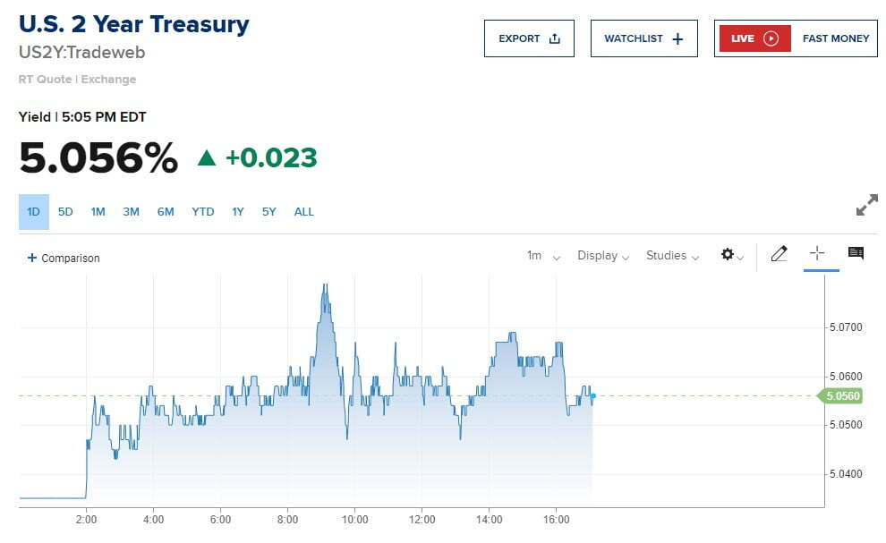 미 국채 2년물 금리는 오후 5시께 전장보다 2.3bp 오른 5.056%를 기록했고, 10년물 수익률은 같은 시간 1.9bp 내린 4.303%에 거래됐습니다. 정리하면 FOMC를 앞두고 금리, 주가 모두 큰 변화 없이 관망세를 보였다고 볼 수 있겠습니다.