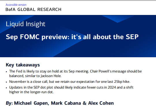 ▶뱅크오브아메리카는 "최근 데이터를 보면 Fed는 지속적 디스인플레이션에 고무됐지만, 활발한 경제 활동으로 인해 인플레이션 재가속을 걱정할 것이다. 점도표의 기준금리 중앙값 전망치는 2023년 한 번 더 25bp 인상을 가리킬 것으로 예상한다. 우리는 2024년 중간값은 기존 전망(6월)보다 25bp 더 높은 4.875%로 올라갈 것으로 보며, 훨씬 더 큰 상승 폭이 나타날 위험도 있다고 생각한다"라고 밝혔습니다. 뱅크오브아메리카는 "11월 금리 인상 가능성은 아슬아슬하지만(close call), 마지막으로 25bp를 올릴 것이란 예상을 유지한다"라고 덧붙였습니다. 정리하면 올해 한 번 더 올린 뒤 내년에는 시장 예상보다 적은 75bp만 인하할 것이란 전망을 제시한다는 것이죠. 게펜은 "이는 현재 시장에 반영된 가격보다 약 40bp 높은 수준이 될 것이다. 2024년 중앙값은 상당히 매파적인 결과가 될 것"이라고 주장했습니다.