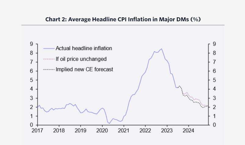 ▶캐피털 이코노믹스도 "브렌트유 가격이 현 수준인 배럴당 약 95달러 수준을 유지한다면 에너지는 연말까지 선진국 시장의 헤드라인 인플레이션 둔화를 방해할 것이다. 인플레이션에 긍정적 이바지할 가능성이 있는 2024년 초에는 상황이 더욱 복잡해진다. 그러나 유가 영향은 다른 인플레이션 둔화 요인에 의해 압도될 가능성이 높다. 투자자들은 유가에 집착하기보다는 근원 인플레이션의 움직임을 관찰해야 한다. 팬데믹 관련 왜곡이 사라지고 통화 긴축의 효과가 나타나면서 근원 인플레이션은 내년 내내 꾸준히 하락할 것으로 예상한다. 물론 장기적으로 유가가 상승하면 기업이 에너지 비용을 소비자에게 전가하기 때문에 이른바 2차 효과를 통해 근원 인플레이션이 높아질 수 있다. 그러나 이는 경제적 여건이 강할 때 큰 위협이 된다. 대부분의 선진국 경제가 향후 6개월 동안 완만한 경기침체에 빠질 것으로 예상되는 상황이어서 디스인플레이션 요인이 여전히 주도할 가능성이 크다"라고 분석했습니다.