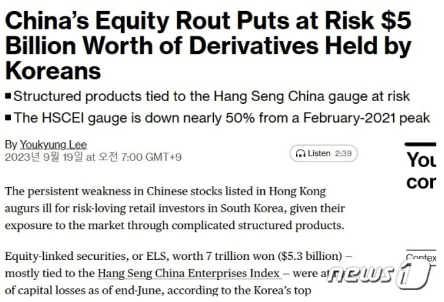 최근 중국 경기 둔화와 부동산 시장 위기로 홍콩의 항셍지수가 연일 하락함에 따라 홍콩 항셍지수와 연계된 파생상품에 투자한 한국인들이 위험에 빠졌다고 블룸버그통신이 18일(현지시간) 보도했다.