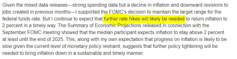 오늘 출동한 Fed 위원들도 일제히 매파적 발언을 쏟아냈습니다. 수잔 콜린스 보스턴 연방은행 총재는 "금리가 이전 전망에서 제시한 것보다 좀 더 높게, 더 오래 유지될 수 있다고 예상한다. 추가 긴축은 확실히 논의에서 배제되지 않을 것"이라고 말했습니다. 미셸 보우만 이사는 "인플레이션은 너무 높다. 인플레이션을 2% 목표치로 되돌리려면 금리를 몇 차례 추가 인상하고, 한동안 제약적 수준에서 유지하는 게 적절할 것이라고 예상한다"라고 밝혔습니다. 메리 데일리 샌프란시스코 연은 총재는 "아직 승리를 선언할 수 있는 지점에 이르지 못했다"라고 말했습니다.