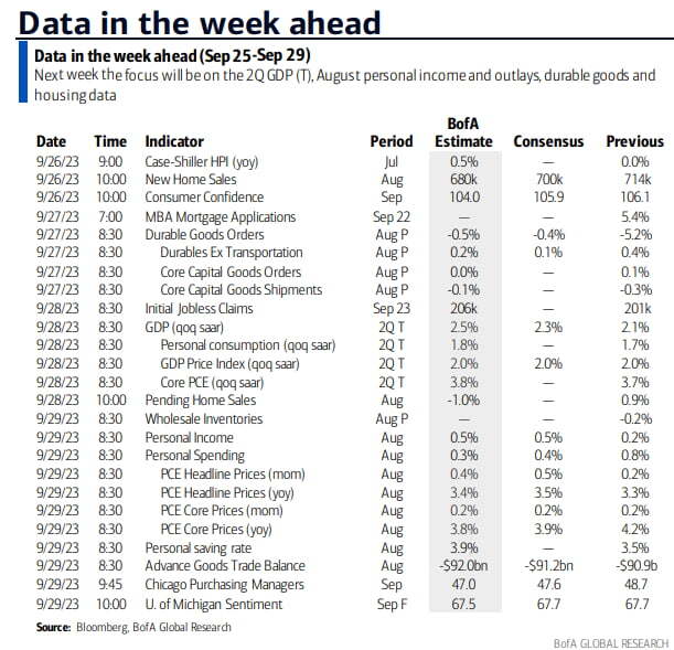 경제 데이터에서는 29일 발표되는 8월 개인소비지출(PCE) 물가가 중요합니다. 월가 컨센서스는 헤드라인 물가는 전년 대비 3.5%(7월 3.3%), 전월 대비 0.5%(7월 0.2%)로 내다봅니다. 유가 상승으로 인해 7월보다 크게 오른다고 보는 것이죠. 근원 물가의 경우 각각 3.9%, 0.2% 오르고요. 7월(4.2%, 0.2%)보다 개선됩니다. 내구재 주문, 신규 주택 판매 및 콘퍼런스보드의 9월 소비자신뢰지수도 나옵니다. 2분기 국내총생산(GDP) 확정치도 발표되죠. GDP는 세 번에 걸쳐 나오는데 처음에는 2.4%로 나왔다가 지난달 2.1%로 하향 수정됐었습니다.