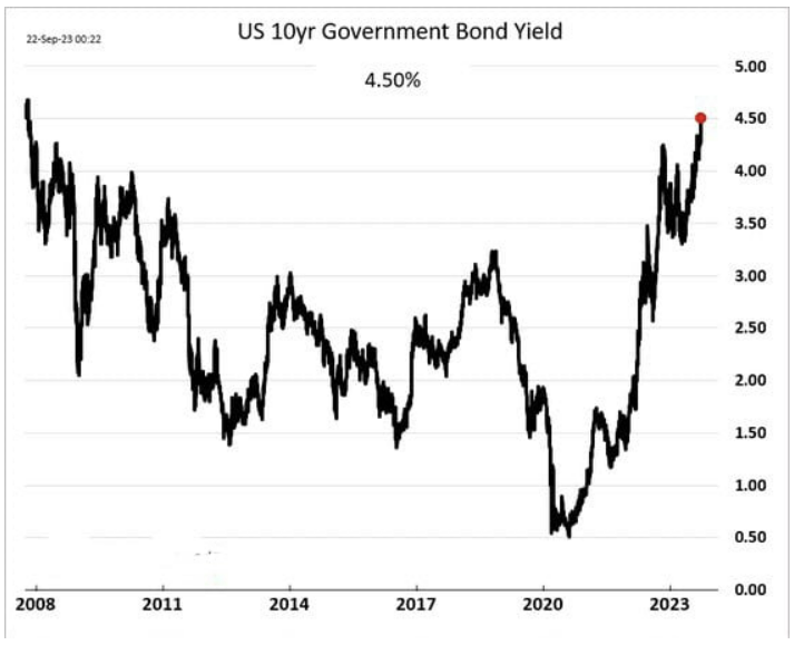 아시아 시장에서 10년물 수익률이 4.5%에 도달하자 스트레티가스는 "광범위한 통화 여건(monetary conditions)은 2007년 이후 이만큼 긴축된 적이 없었다. 통화 여건이 언제든 이런 긴축적 수준에 도달하면 경기 침체가 곧 뒤따르게 된다"라고 분석했습니다.