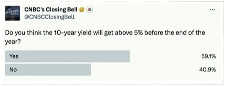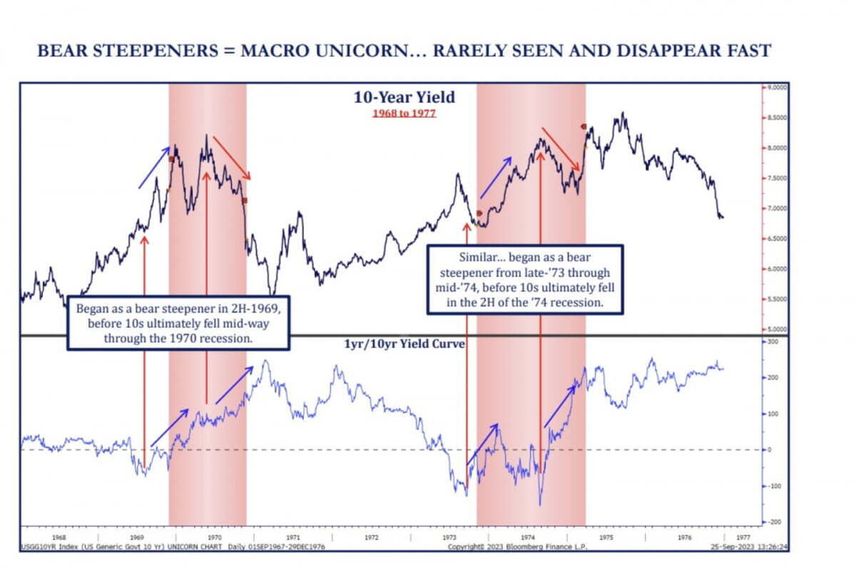 시장에는 이처럼 10년물 5%를 거론하는 보고서가 줄을 잇고 있습니다. 스트레티가스의 스티브 베론 전략가는 지금과 같은 베어 스티프너(bear steepener, 장기 금리가 단기보다 더 크게 오르면서 채권 수익률 곡선이 가팔라지는 것)가 나타나면 10년물 금리는 경기 침체가 발생하기 직전까지 올랐다고 주장했습니다. 인플레이션이 높았던 1968년부터 1977년을 따져보면 1969년 하반기 나타난 베어 스티프너는 1970년 경기 침체 전까지 계속됐고, 1973년 말부터 1974년 중반까지 나타났을 때도 1974년 하반기 침체 전까지 상승세를 이어갔다고 분석했습니다. 그러면서 기술적으로 10년물 금리가 5.2%까지 오를 수 있다고 주장했습니다.