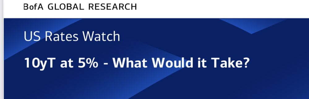 뱅크오브아메리카는 '10년물 국채 5%, 무엇이 필요할까'라는 제목의 보고서에서 "금리 상승의 동인은 미국 경제 재가속"이라고 주장했습니다. 그러면서 "경제가 계속 강세를 유지한다면 높은 금리를 지지할 수 있다. 그러나 이는 실질적으로 강한 재가속을 말하며 연착륙은 그렇게 높은 금리를 뒷받침할 수 없다. 연착륙은 10년물 금리를 다시 4%로 낮출 것"이라고 지적했습니다. 다만 "국채 공급이 상대적으로 높은 수준으로 유지할 것"이라며 쏟아지는 국채의 물결이 금리를 높이는 요인이 될 수 있다고 덧붙였습니다. 뱅크오브아메리카는 "연착륙이 기본 시나리오이고, 연착륙이 발생하면 10년물 금리는 5% 밑으로 내려갈 것이다. 최근 경제가 강하다는 확신은 조금씩 약화하고 있다. 5%까지 오를 것으로 보지는 않지만, 많은 고객이 걱정하고 있다"라고 밝혔습니다.