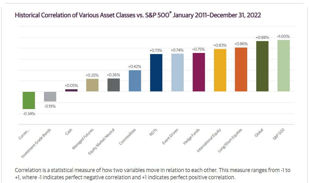 구겐하임 파트너스 분석에 따르면 달러는 주요 자산 가운데 S&P500 지수와 가장 관계가 나쁜 자산입니다. 상관관계가 -0.34입니다. 두 변수 사이에 관계가 없으면 상관계수는 0입니다. 완벽한 관계가 있으면 1이고, 완벽한 역관계가 있으면 -1입니다.