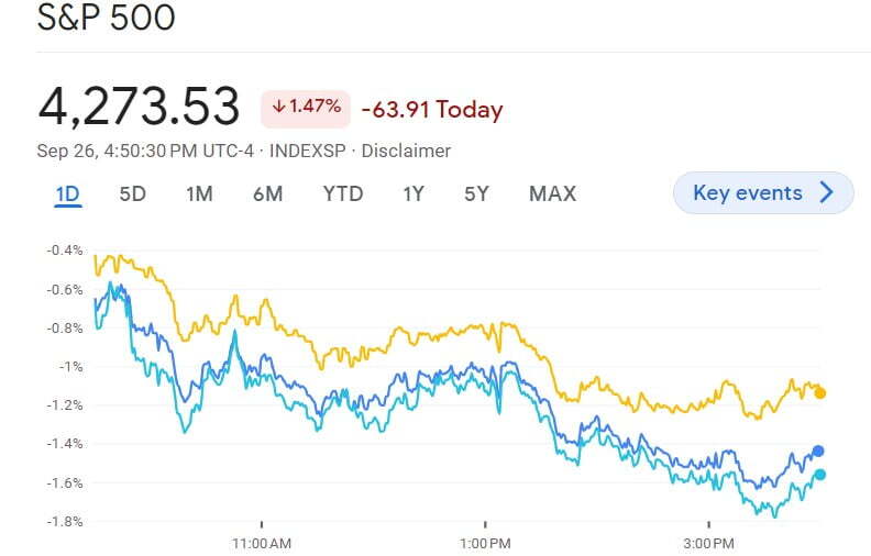 뉴욕 증시에서 주요 지수는 아침 0.4~0.6% 수준의 내림세로 출발했습니다. 금리가 오름세를 보이자, 내림세를 가속했습니다. 결국, 다우는 1.14%, S&P500 지수는 1.47% 내렸고 나스닥은 1.57% 하락했습니다. S&P500 지수의 종가는 4273.53으로 6월 초 이후 처음으로 4300 아래로 떨어졌습니다. 9월 들어 벌써 5.19%나 내렸습니다. 모하메드 엘 에리언 알리안츠 고문은 "금리가 상승했지만, 아직 충분한 구매자를 구하지 못하고 있고, 연간 최고에 달한 달러, 실망스러운 데이터 등이 주식에 대한 압박을 강화했다"라고 말했습니다. CFRA의 샘 스토발 전략가는 ”투자자들은 채권 수익률 상승이 경제, 주식시장, Fed, 달러 가치에 어떤 영향을 미칠지 여전히 긴장하고 있고 불안해 한다. 투자자들이 경제적 명확성이 부족한 상태에서 (자산을 팔아) 마음을 가볍게 하기로 한 것 같다"라고 설명했습니다.