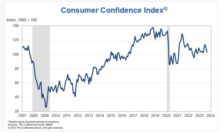 콘퍼런스보드가 발표한 9월 소비자신뢰지수는 103.0으로 전달(108.7)이나 시장 예상치(105.5)를 밑돌았습니다. 2개월 연속 하락했고, 4개월 내 최저치입니다. 성장의 핵심 동력인 소비자 지출에 좋지 않은 징조입니다. 콘퍼런스보드는 "소비자들은 휘발유 가격 상승과 높은 이자율에 대한 우려를 표했다. 경기 침체를 예상하는 소비자 비율도 증가했다"라고 밝혔습니다.