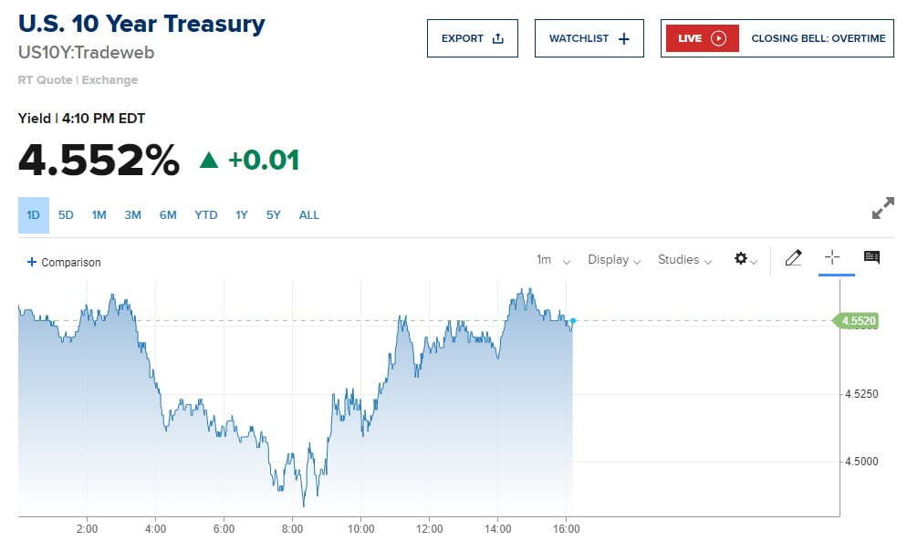 MUFG의 조지 곤칼브스 매크로 전략가는 "금리를 더 오래, 더 높게 유지하려는 Fed의 목표로 인해 10년물 수익률은 4.75%로 올라갈 것이다. 10년물 수익률 범위의 상단 목표치인 4.5%가 뚫린 만큼 4.75%, 아마 5%를 향한 기술적 돌파가 나타날 위험이 있다"라고 밝혔습니다.