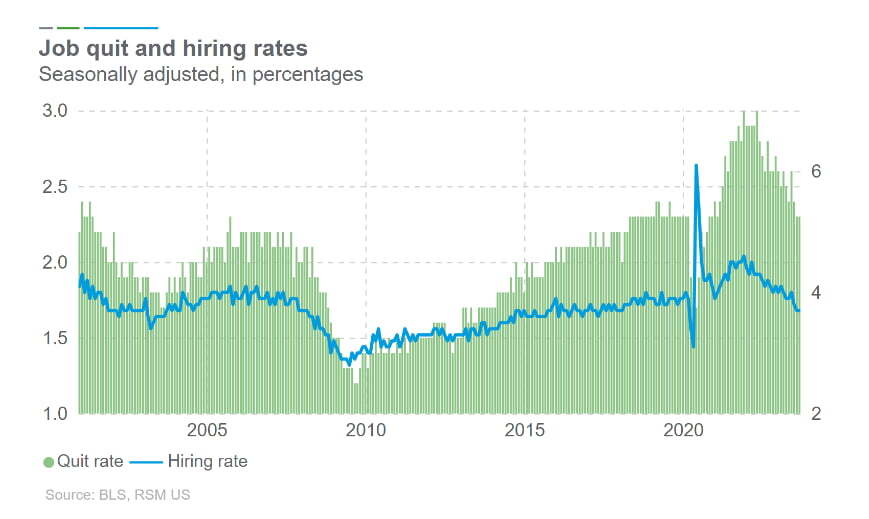 최근 노동시장에 새로 들어온 인력이 증가한 덕분에 실업자 1인당 채용공고 건수는 1.5개로 유지됐습니다. 또 채용 건수와 퇴직 건수는 각각 590만 건과 570만 건으로 7월과 거의 같았습니다. 퇴직자 내에서 고용에 대한 자신감을 나타내는 자발적 퇴직자 수도 360만 건으로 전월과 거의 비슷했습니다. 자발적 퇴직률도 2.3%로 같았고요. 작년 4월의 3% 정점에서 줄어든 것이죠. 전반적인 노동시장의 둔화 추세는 유지되고 있는 것입니다.