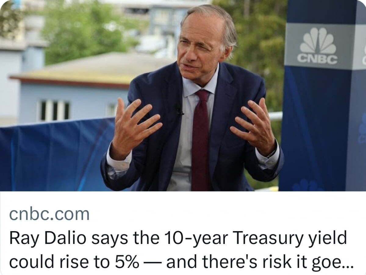오늘 아침 브릿지워터의 레이 달리오는 10년물 국채 수익률이 5%에 이를 수 있다고 말했습니다. 인플레이션이 Fed 목표인 2%를 상회하고 장기적으로 3.5% 부근으로 유지되리라 생각한다는 것입니다. 여기에 수요와 공급의 균형을 맞추기 위해서는 금리가 인플레이션보다 1.5%포인트 높아야 한다고 주장했습니다.