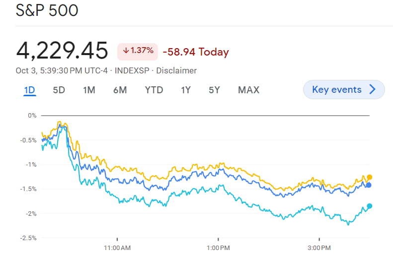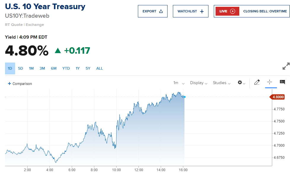 찰스 슈왑의 랜디 프레드릭 트레이딩 전무는 "국채 수익률 상승, 완고하게 높은 유가, 달러 강세 등이 모두 주식을 압박하고 있다. 일부 Fed 인사의 매파적 발언과 의회 관련 불확실성, 특히 매카시 의장의 축출이 불안을 가중시켰다. 무엇보다 10년물 금리가 16년 만에 최고치를 경신하고 있는 게 아마도 주식을 압박한 가장 큰 요인일 것"이라고 말했습니다.