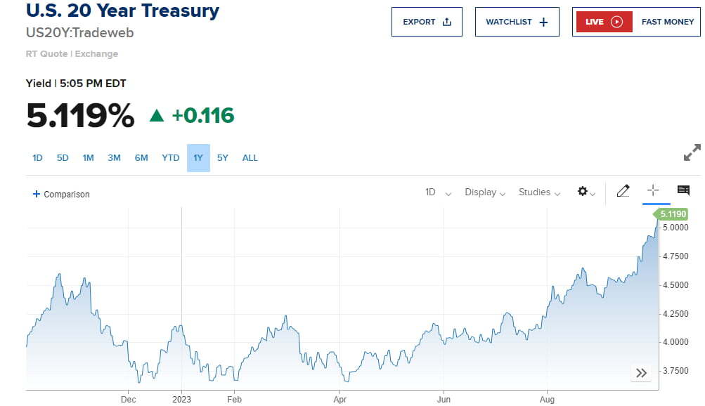 한 채권 시장 관계자는 "지금 채권 시장에 있는 돈으로는 쏟아지는 국채를 감당할 수 없다. Fed나 외국인 투자자도 사기 어렵다. 그렇다면 이를 소화하려면 미국 가계에서 새로운 돈이 들어와야 한다. 즉 뮤추얼 펀드가 채권을 사야 하고 개인 투자자들도 주식을 팔아 채권을 매수해야 한다. 그러려면 채권 금리는 충분히 더 높아져야 한다. 결국, 주가가 상당 폭 하락해야 채권 금리가 안정될 것"이라고 주장했습니다. 이 관계자는 지난 2년간 인플레이션과 금리가 높게 유지될 것이라고 주장해왔고, 많은 자금을 머니마켓펀드(MMF)에 넣어놓았습니다. 그는 "지금 MMF에서 5.3% 정도를 받고 있는데, 30년물 금리가 5%를 넘으면 어느 정도는 매력적이라고 생각한다"라고 말했습니다. 오늘 30년물은 12.7bp 폭등한 4.923%에 거래됐습니다. 그리고 20년물은 11.6bp 급등해 5.119%를 기록했습니다.
