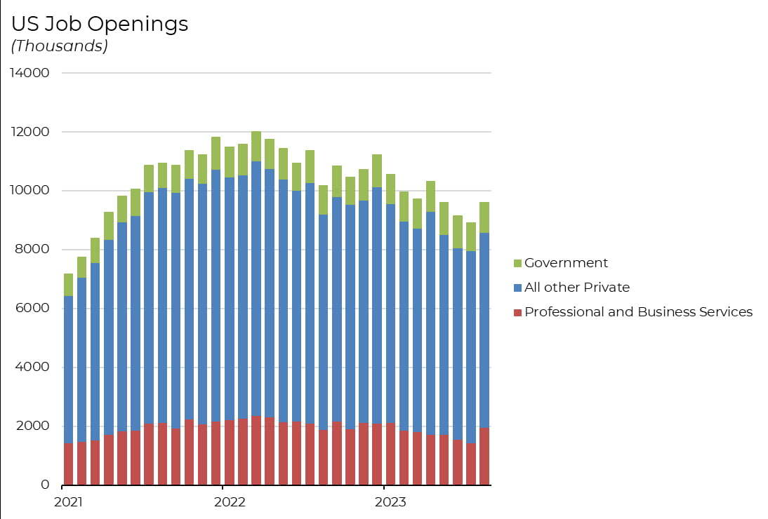 그런데 8월 수치는 69만 개 증가한 961만 개로 발표됐습니다. 7월 수치도 892만 개로 상향 조정됐습니다. 4개월 만에 다시 오름세로 전환한 것이며, 11개 업종 중 7개가 늘어나는 등 채용공고 증가는 산업 전반에 걸쳐 광범위했습니다. 기업들의 인력 수요가 여전히 강하고 노동시장이 Fed가 원하는 만큼 식고 있지 않은 것입니다. 네드 데이비스 리서치는 "Fed가 긴축 정책을 시작한 2022년 3월 이후 채용공고가 감소하는 추세임에도 불구하고 팬데믹 이전에 비해 여전히 거의 40% 더 많다. 최근 재상승은 노동 수요가 여전히 남아 있음을 시사한다"라고 분석했습니다.