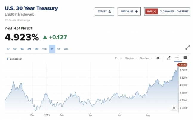 2007년 금융위기 이후 16년 만에 최고치를 찍은 미국 국채 수익률이 달러 강세를 부추겼다. 3일(현지시간) 글로벌 채권 시장의 거센 매도세로 미 30년 만기 국채 수익률이 장중 4.95%까지 뛰었다. 인플레이션을 억제하기 위해 고금리를 '더 오래' 유지하겠다는 연준(연방준비제도이사회)의 신호 탓이다.