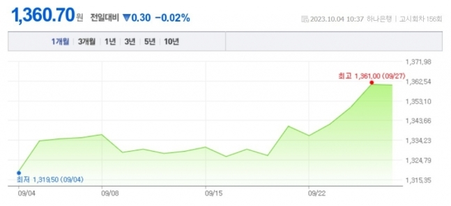 4일 10시 37분 현재 서울외환시장에서 원/달러 환율은 1360.70원이다. 장 초반 전 거래일 대비 10원 넘게 급등해 연고점을 경신한 뒤 상승세를 보이고 있다. 원/달러 환율이 장중 1360원을 넘은 것은 지난해 11월 22일(1362.9원) 이후 처음이다. 종가 기준으로 넘을 경우 11개월 만에 가장 높은 수준이 된다.