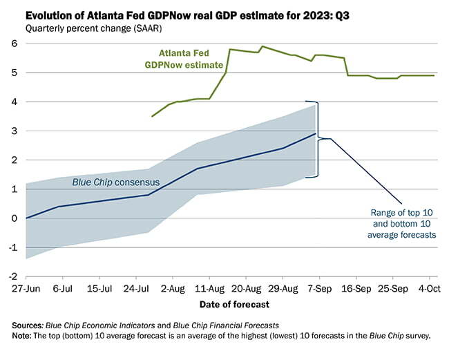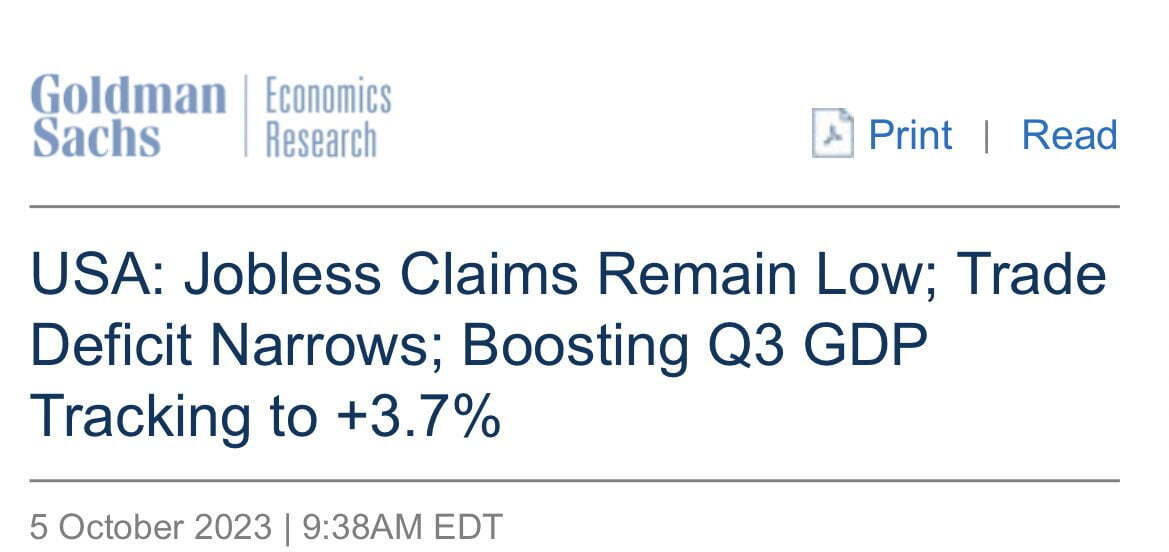 골드만삭스는 오늘 데이터가 나온 뒤 3분기 성장률 추정치를 연율 3.4%에서 3.7%로 높였습니다. 애틀랜타 연방은행의 GDP나우는 4.9%로 유지했고요. 미국 경제는 약간 둔화 조짐이 있긴 하지만 여전히 역사적 추세보다 강력한 수준을 유지하고 있는 것이죠.