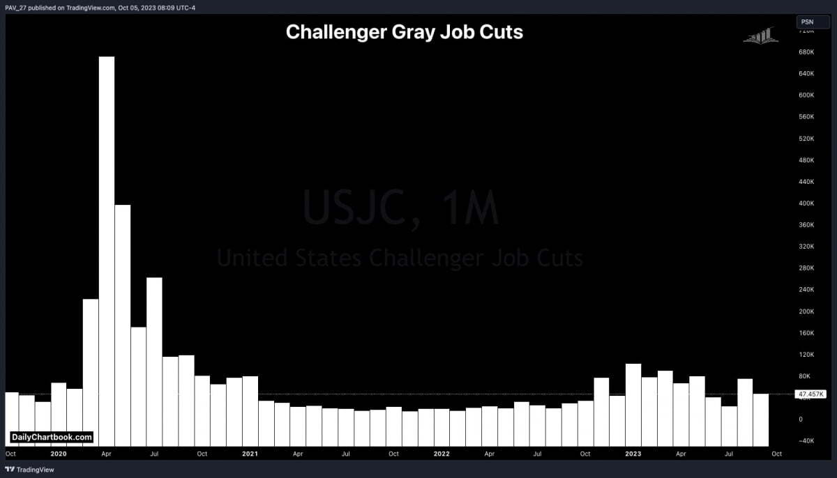해고가 많지 않다는 것은 챌린저, 그레이 앤드 크리스마스(CG&C)의 감원보고서에서도 드러났습니다. 기업의 9월 감원 계획은 4만7457명으로 전월 7만5151명보다 37% 감소했습니다. 지난해 같은 기간보다는 58% 많은 수준이긴 합니다. 9월 감원 계획 중 약 3분의 1이 소매업 부문에서 나타났습니다. 이는 소비 지출 감소에 따른 것일 가능성이 큽니다. 또 UAW 파업과 관련해 자동차 부문에서도 해고가 눈에 띄게 증가했습니다.