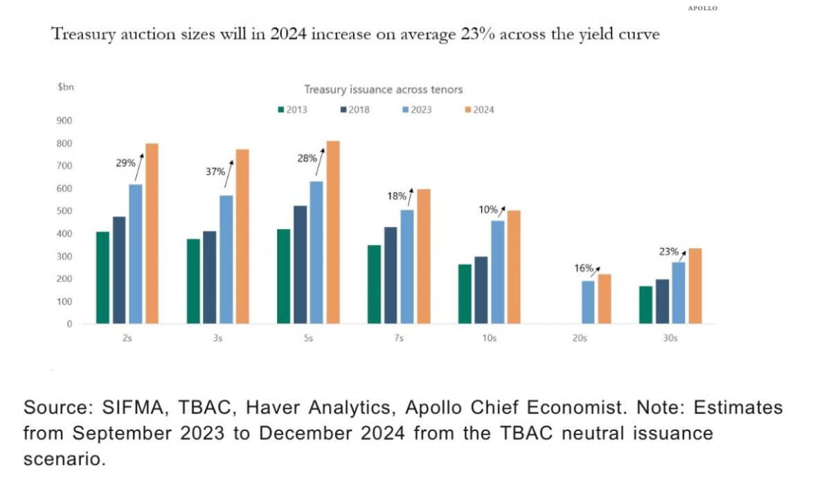 아폴로 매니지먼트의 토스텐 슬록 이코노미스트는 미국 재무부 차입자문위원회의 발행 시나리오를 보면 2024년 국채 경매 규모는 수익률 곡선 전반에 걸쳐 평균 23% 증가할 것이라고 밝혔습니다. 3년물 발행이 37% 증가하고 5년물 발행이 28% 늘어납니다. 10년물은 10%, 30년물은 23% 증가하고요. 그는 "무위험 자산인 국채 공급의 급격한 증가는 투자자들을 회사채 등 다른 채권에서 국채로 이동하게 할 것"이라며 투자등급 회사채를 포함한 모든 채권의 금리가 높아질 수 있다고 봤습니다.