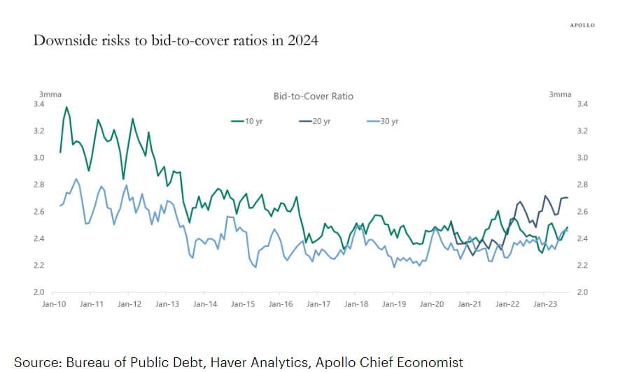 아폴로 글로벌 매니지먼트에 따르면 미 국채 입찰에서 응찰률(bid-to-cover ratio)은 수익률 곡선 전반에 걸쳐 국채에 대한 수요가 얼마나 되는지를 나타냅니다. 그런데 이런 응찰률이 낮아지고 있습니다. 특히 장기물에서 그런 현상이 나타납니다. 토스텐 슬록 이코노미스트는 "결론은 국채 공급이 계속해서 증가하고 있으며, 투자자들은 국채 수요 약세의 징후를 알아보기 위해 응찰률을 살펴봐야 한다는 것"이라고 말했습니다.