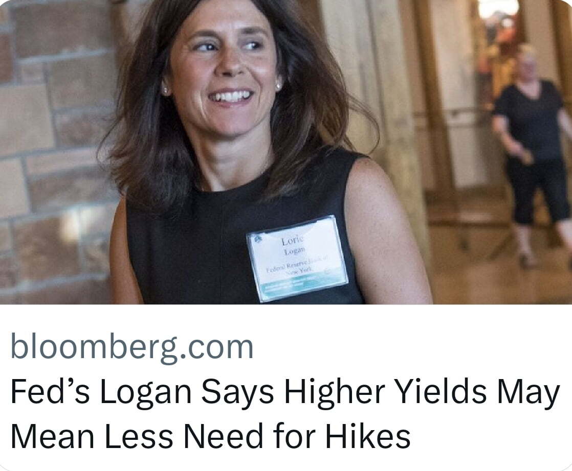 '매파'인 로리 로건 댈러스 연방은행 총재는 오늘 아침 미국 실물경제학회(NABE)에서 "우리는 계속해서 제한된 금융여건이 필요할 것이다. 만약 기간 프리미엄이 높아져 장기 금리가 상승한 채로 유지된다면 기준금리를 인상할 필요가 줄어들 수 있다"라고 밝혔습니다. 그는 지난주까지만 해도 인플레이션을 목표로 되돌리려면 여러 차례 금리 인상이 필요할 수 있다고 했던 사람입니다.