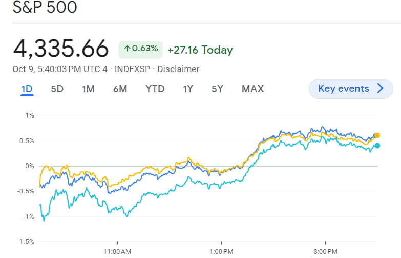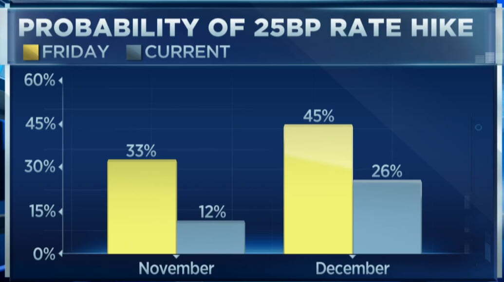 이런 Fed 관계자 발언이 전해지면서 시장은 반등하기 시작했습니다. 뱅크오브아메리카는 "높아진 금리가 Fed의 역할을 대신하고 있음을 시시한 Fed 관계자들 발언을 고려할 때 이번 주 9월 생산자물가(PPI)와 소비자물가(CPI)에서 좋은 수치가 나온다면 11월 기준금리 인상 방안을 테이블에서 제외할 수 있다"라고 분석했습니다. 시카고상품거래소의 Fed워치 시장에서는 11월 기준금리 인상 확률이 지난주 말 33%에서 오늘 12%로 크게 낮아졌습니다.