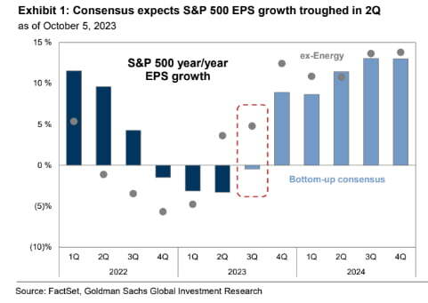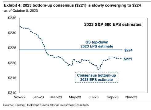 월가가 희망을 걸고 있는 것은 3분기 어닝시즌입니다. 월가에서는 기업 이익이 또 예상을 넘어서면서 연말 랠리가 시작될 것이란 기대가 큽니다. 골드만삭스는 올해 2분기를 바닥으로 3분기부터 S&P500 기업들의 주당순이익(ESP)이 전년 대비 상승할 것으로 봅니다. 골드만은 올해 EPS는 작년보다 1% 증가한 224달러로 제시했습니다. 그러면서 컨센서스 EPS가 점점 더 자기들의 예상치 수준으로 올라오고 있다고 밝혔습니다. 골드만은 내년은 237달러(+5%), 2025년에는 250달러(+5%)로 이익이 계속 증가할 것으로 봅니다.