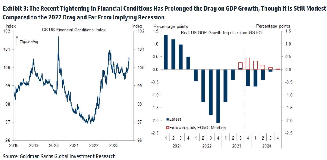 여기에 골드만삭스는 "최근 몇 달 동안 금리는 곡선 전반에 걸쳐 상승했다. 이로 인해 내년에 대략 -0.5%포인트의 성장 타격을 추정한다. 이는 의미가 있지만, 경기 침체를 위협하기에는 너무 작은 수준"이라고 밝혔습니다.