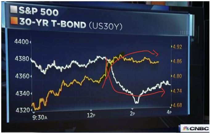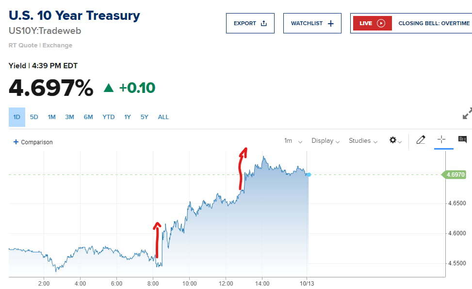 12일(미 동부시간) 투자자들은 아침에 발표된 9월 소비자물가(CPI)를 주목했습니다. 헤드라인 물가가 예상보다 살짝 높게 나왔습니다. 금리는 상승했고 주가는 보합세를 보였습니다. 그런데 오후 1시가 되자 금리가 폭등하고 주가는 급락하기 시작했습니다. CPI가 문제가 아니었습니다. 미 재무부의 국채 30년물 경매 결과가 좋지 않게 나온 탓이었습니다. 투자자들이 국채 홍수 속에서 장기물 매수를 꺼리고 있다는 게 다시 드러난 것이죠. 결국, 채권 금리가 다시 큰 폭 상승세로 마감하자 증시는 힘없이 거래를 끝냈습니다.