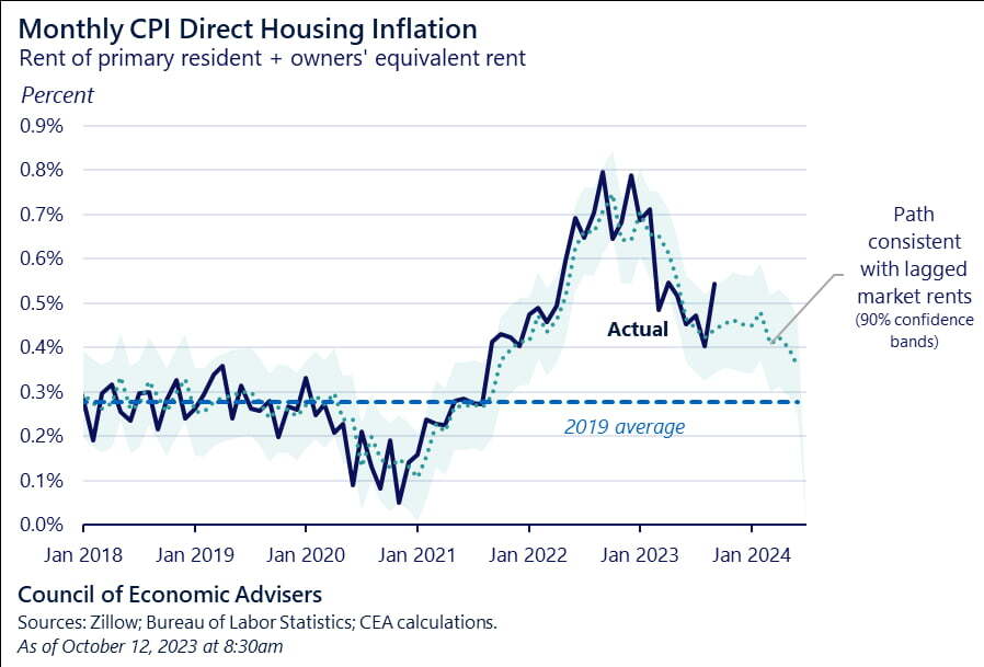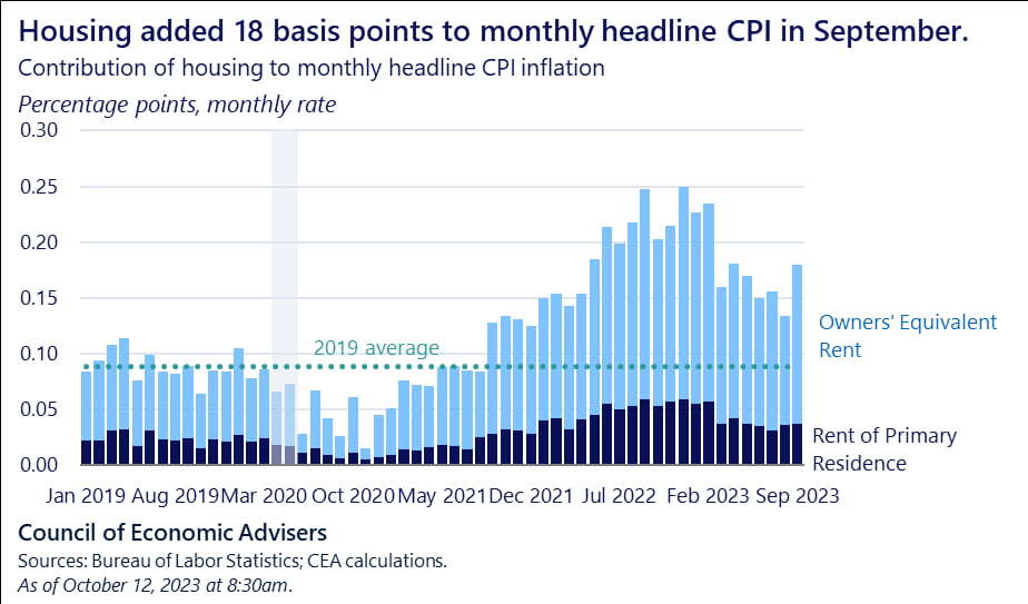 그러나 불안 요인이 있습니다. 파월 의장이 주거비를 제외하고 보겠다고 한 것은 시간이 흐르면 주거비는 떨어질 것으로 봤기 때문입니다. 하지만 정말 낮아질지, 언제부터 떨어질지에 대한 의문이 있습니다. 모기지 금리가 7.5%를 넘었는데도 매물 부족으로 집값은 여전히 오름세를 유지하고 있고, OER은 집주인들이 이런 집값에 기초해서 답하는 설문조사를 통해 산출됩니다. 찰스 슈왑의 캐시 존스 채권 전략가는 "오랫동안 기다려온 주거비(임대료) 하락은 CPI에서는 여전히 보이지 않았다. 시장은 그 일이 일어날 때까지 신중할 것으로 보인다"라고 지적했습니다.
