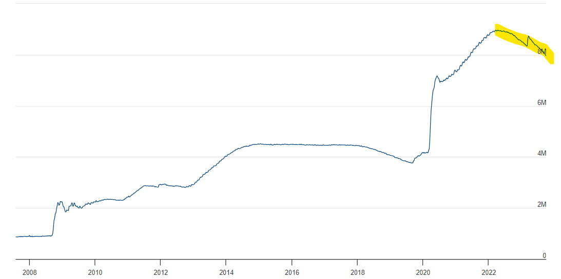 당장 Fed가 미 국채를 사겠다고 나설 가능성은 크지 않습니다. Fed는 현재 매달 950억 달러씩 보유채권을 줄이는 QT를 하고 있습니다. 어제 FOMC 회의록을 보면 "참석자들은 대차대조표 규모를 지속해서 줄이는 과정이 거시경제 목표를 달성하기 위한 접근 방식의 중요한 부분임을 확인했다. 몇몇 참가자들은 기준금리 인하를 시작한 이후에도 대차대조표 감축이 한동안 계속될 수 있다고 지적했다"라는 문구가 들어있습니다. 이렇게 QT를 지속하면서 Fed의 자산은 지난 11일 기준 7조9147억 달러까지 떨어졌습니다. 작년 4월 8조9600억 달러를 넘었던 것에 비하면 1조 달러 이상 줄어든 것이죠. 시장의 과잉 유동성을 대변하는 역레포 시장에 몰린 돈은 오늘 1조1570억 달러까지 감소했습니다. 역시 작년 말 2조5000억 달러에 비하면 거의 1조4000억 달러 적은 것이죠.