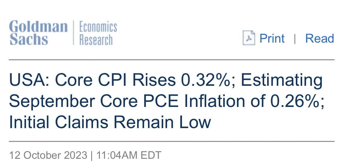 골드만삭스는 "오늘 CPI 보고서가 11월 FOMC 회의 결과에 영향을 미칠 것으로 예상하지 않는다. 통화 정책은 변함없을 것으로 본다. Fed 관계자들의 최근 발언도 FOMC가 기준금리를 동결할 가능성이 크다는 강력한 신호를 보냈다"라고 분석했습니다.