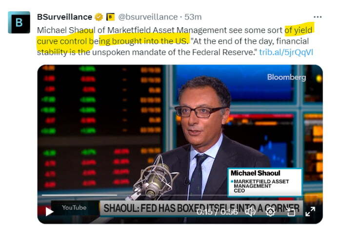 더는 시장에서 국채 소화가 어려우니 Fed가 돈을 찍어 국채를 매수함으로써 금리를 낮추라는 것이죠. YCC는 양적 완화(QE)의 일종입니다. 지금 양적 긴축(QT)에서 돌아서라는 얘기입니다.