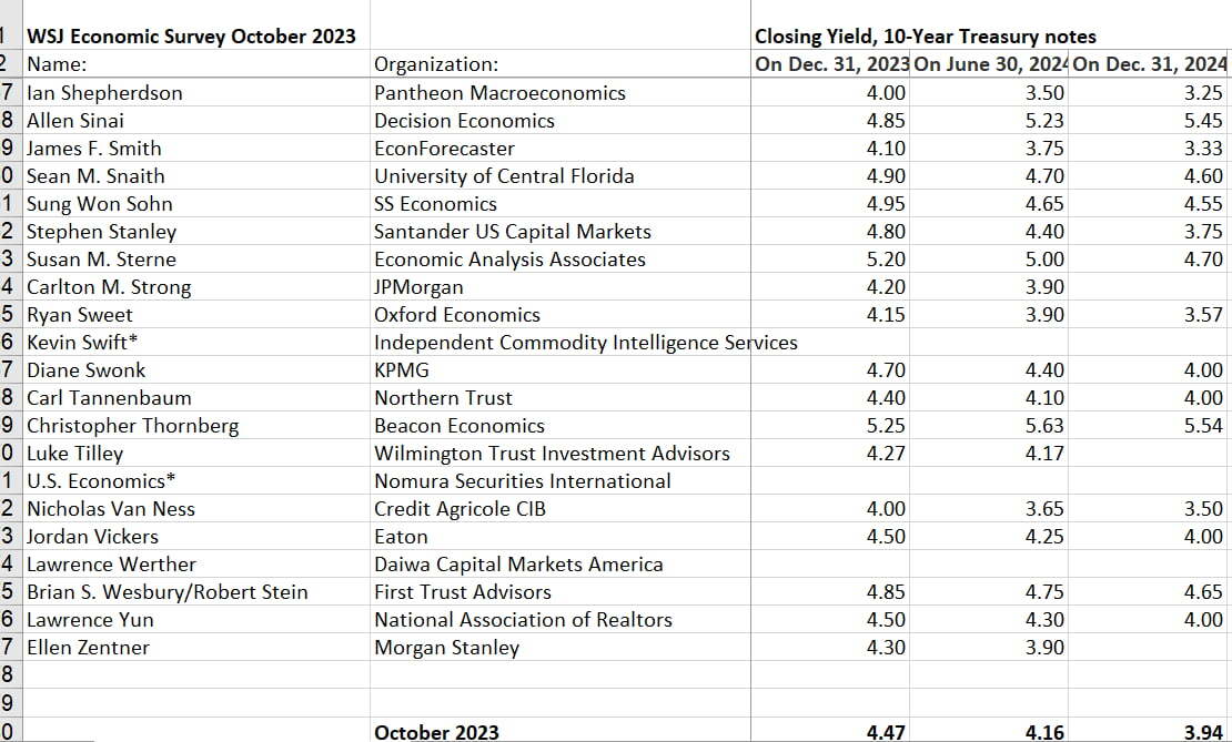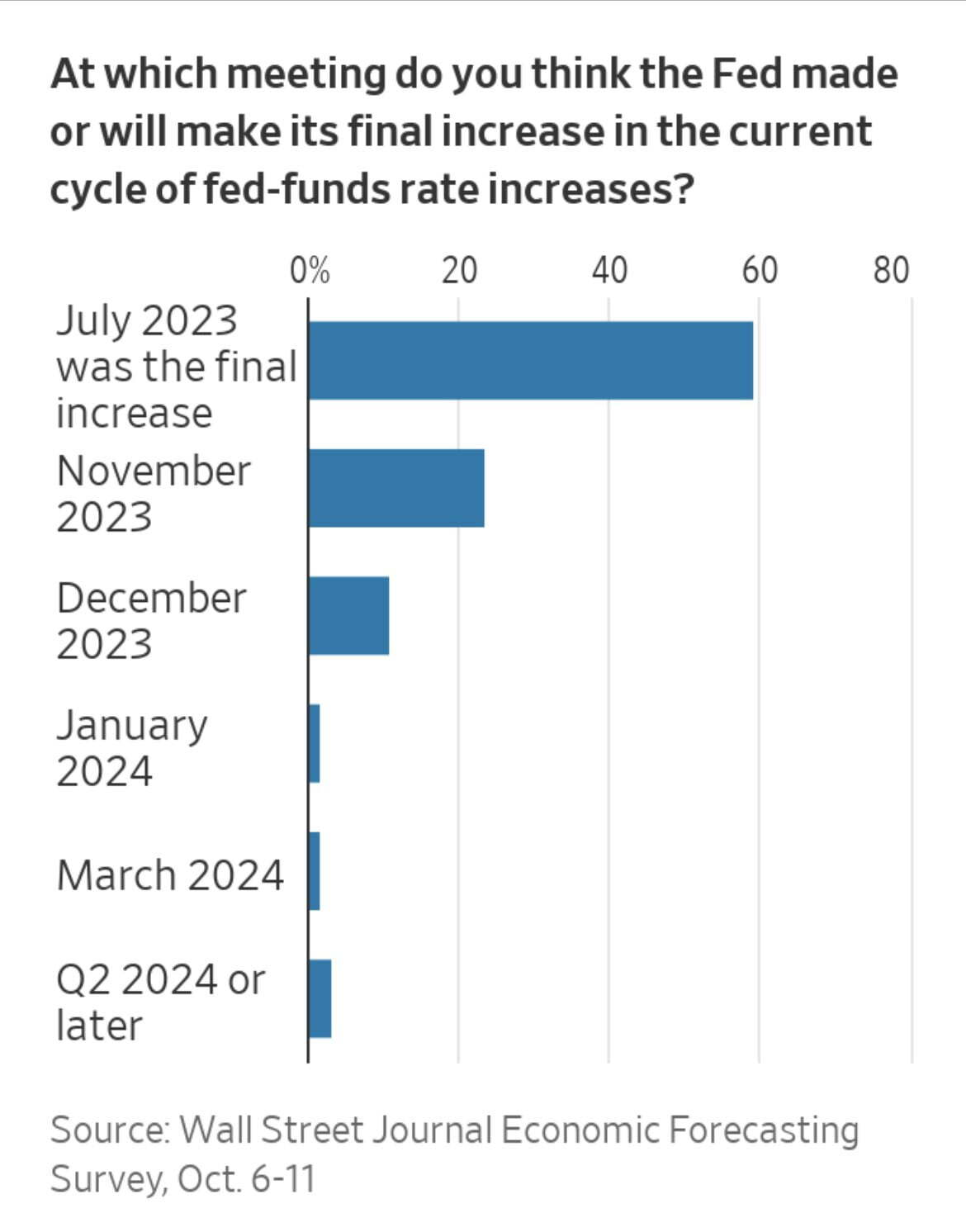 S&P500 지수 11개 업종이 모두 오르는 광범위한 상승세를 보여줬습니다. 금리 오름세에도 불구하고 주식이 랠리를 펼쳤다는 사실에 많은 환호가 나왔습니다. 기본적으로 금리가 경기 둔화와 함께 더 낮아질 것으로 보는 시각이 많기 때문으로 분석됩니다. WSJ 설문 조사를 보면 이노미스트들은 치솟고 있는 장기 금리가 앞으로 몇 달 안에 둔화할 것으로 예상했습니다. 평균적으로 미 국채 10년물 수익률은 올해 말 4.47%에 마감되고, 내년 6월 30일에는 4.16%까지 하락할 것으로 전망했습니다.