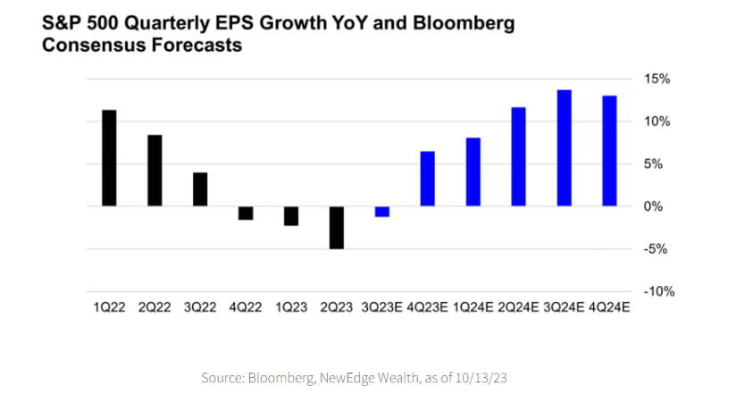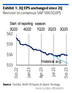 둘째, 기업들이 제시하는 4분기, 내년 실적 가이던스입니다. 월가는 S&P500 기업 이익이 4분기에는 7.8% 증가로 가속화될 것으로 예상합니다. 또 2024년 연간 성장률을 12.2% 성장할 것으로 예상합니다. 올해 0.9%보다 크게 개선되는 것이죠. 이런 상황에서 기업 가이던스가 이런 기준에 부합할지 지켜봐야 합니다. 도이치뱅크는 기업이 보는 거시경제 환경과 소비자로부터의 신호, 그리고 재고 상황이 어떤지 듣는 게 중요하다고 설명했습니다.