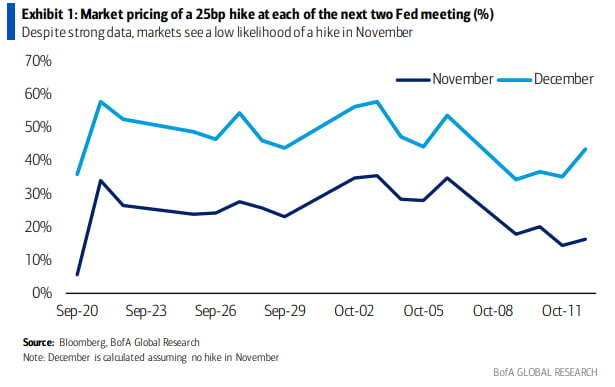 ▷9월 생산자물가(PPI)와 소비자물가(CPI) 모두 예상보다 약간 높은 수준임에도 불구하고 Fed는 11월 1일 금리를 인상하지 않으리라고 예상한다. 불확실성이 너무 많다. 중동의 긴장뿐만 아니라 공화당이 아직 하원의장 선출에 합의하지 못했기 때문에 11월 중순 실제 정부 폐쇄 가능성이 분명히 커졌다.
