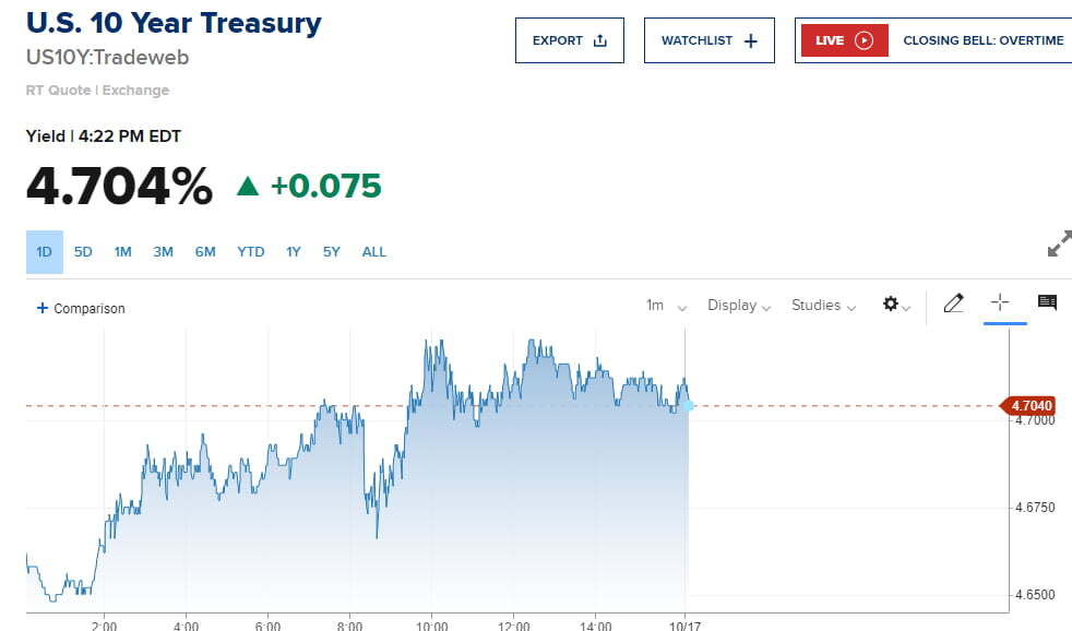 뉴욕 채권시장에서 금리는 아침부터 치솟았습니다. 오전 10시께 10bp 가까이 오른 4.725%까지 오르기도 했습니다. 오전 10시 뉴욕 연은이 집계한 10월 엠파이어 스테이트 제조업 지수가 전달보다 6.5포인트 하락한 -4.6으로 나타난 뒤 안정된 모습을 보이긴 했지만 그래도 종일 오름세가 유지됐습니다. 오후 4시 20분께 미 국채 10년물 수익률은 7.5bp 오른 4.704%를 기록했습니다. 2년물은 4.4bp 오른 5.098%에 거래됐습니다.