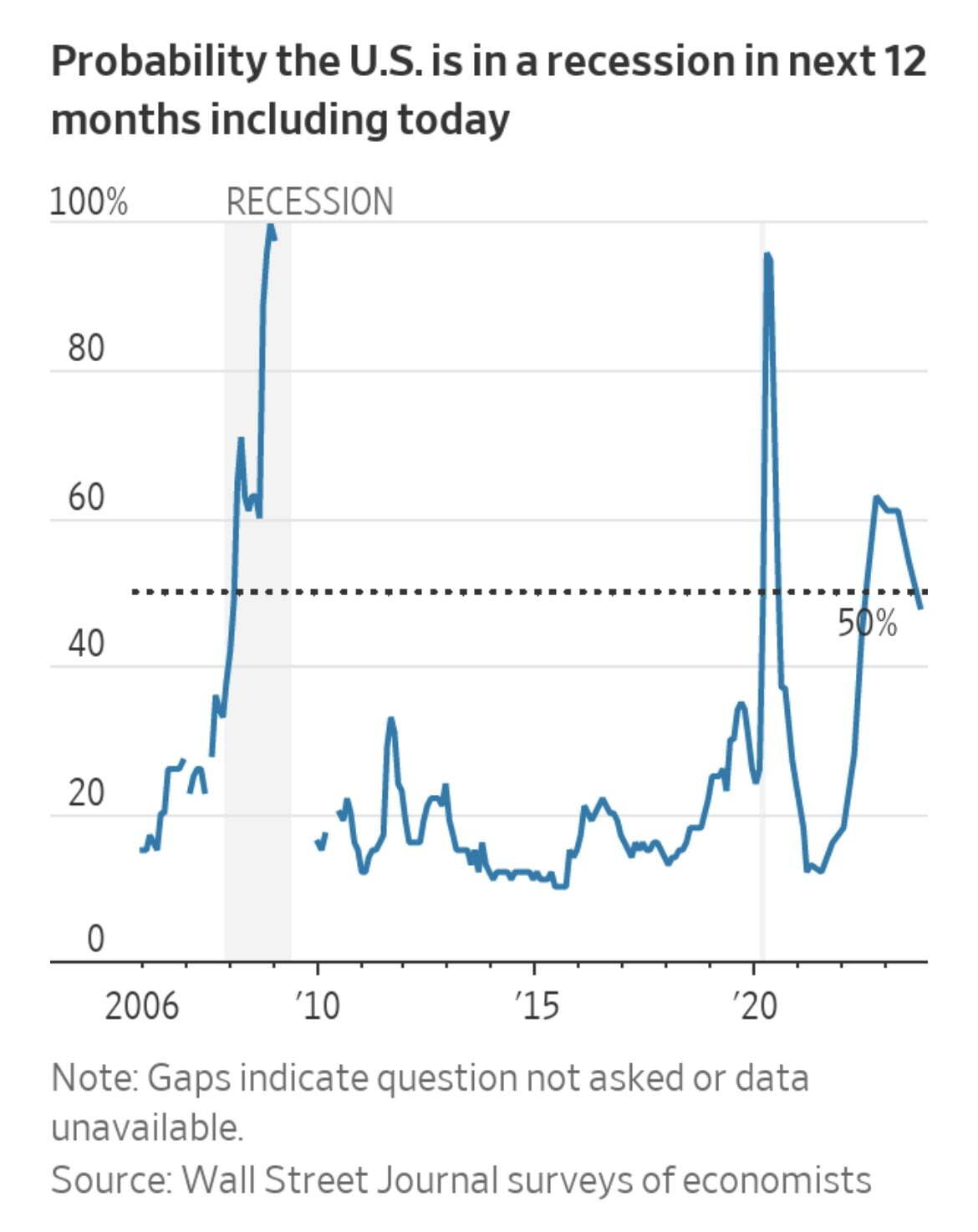 월스트리트저널(WSJ)은 15일 '경기 침체는 더는 컨센서스가 아니다'(A Recession Is No Longer the Consensus)라는 기사에서 향후 1년 내 미국에서 경기 침체가 발생할 것으로 예상하는 이코노미스트가 1년여 만에 절반 이하로 줄었다고 전했습니다. 또 10명 중 6명은 Fed의 금리 인상이 끝났다고 생각하고 있다고 덧붙였습니다.