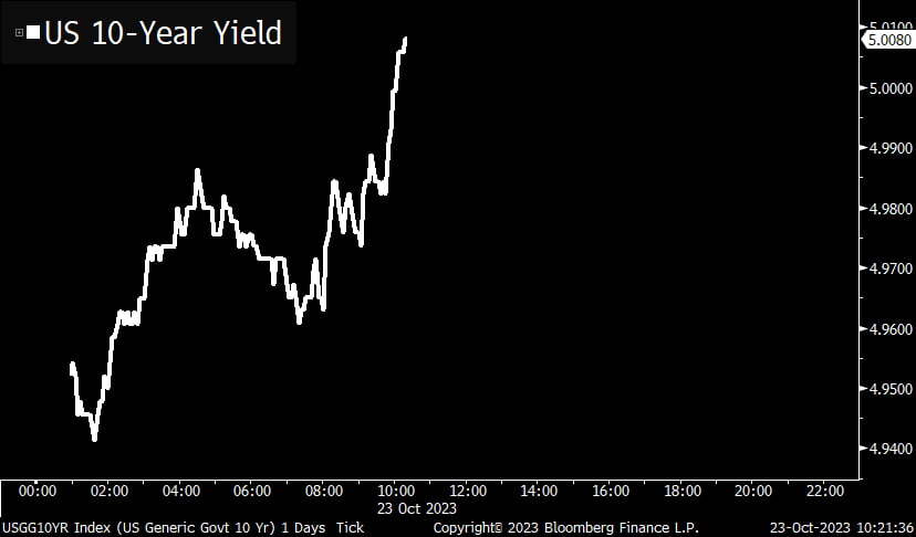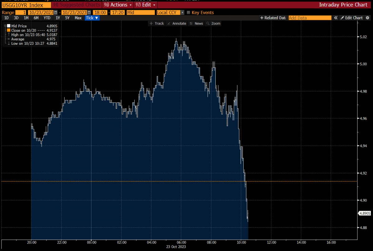 하지만 월가는 아침부터 시끄러웠습니다. 뉴욕 채권시장이 개장하자마자 미 국채 10년물 금리는 치솟더니 한때 5.021%까지 올랐습니다. 2007년 7월 이후 16년 만에 처음으로 5%를 돌파한 것입니다. 금리가 또 꿈틀댄 데는 두 가지 이유가 있었습니다.