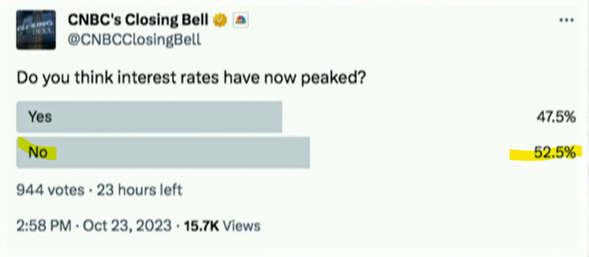 그러나 CNBC가 오늘 투자자 대상으로 '금리가 정점을 찍었다고 생각하나'라고 물었더니 오후 3시 현재 944명이 참여한 가운데 52.5%는 "아니다", 47.5%는 "맞다"로 더 오를 것으로 보는 시각이 조금 더 많았습니다. 윤제성 뉴욕생명 자산운용 최고투자책임자(CIO)는 "오늘 채권 랠리는 애커먼으로 인한 하루 랠리라고 밖에는 달리 생각할 이유가 없다. 채권시장이 경기 침체가 가까워졌다고 생각하기 전까지는 금리 상승세가 끝났다고 확신하기 어렵다. 내가 말할 수 있는 건 시장이 임박한 침체를 인식하기 전까지는 금리 상승세가 끝났다고 보기 어렵다는 것"이라고 설명했습니다. 채권시장 관계자는 "헤지펀드의 공매도 순포지션은 여전히 많이 남아 있다. 목요일, 금요일 경제 지표에 따라 양방향으로 많이 움직일 수 있을 것 같다"라고 말했습니다.