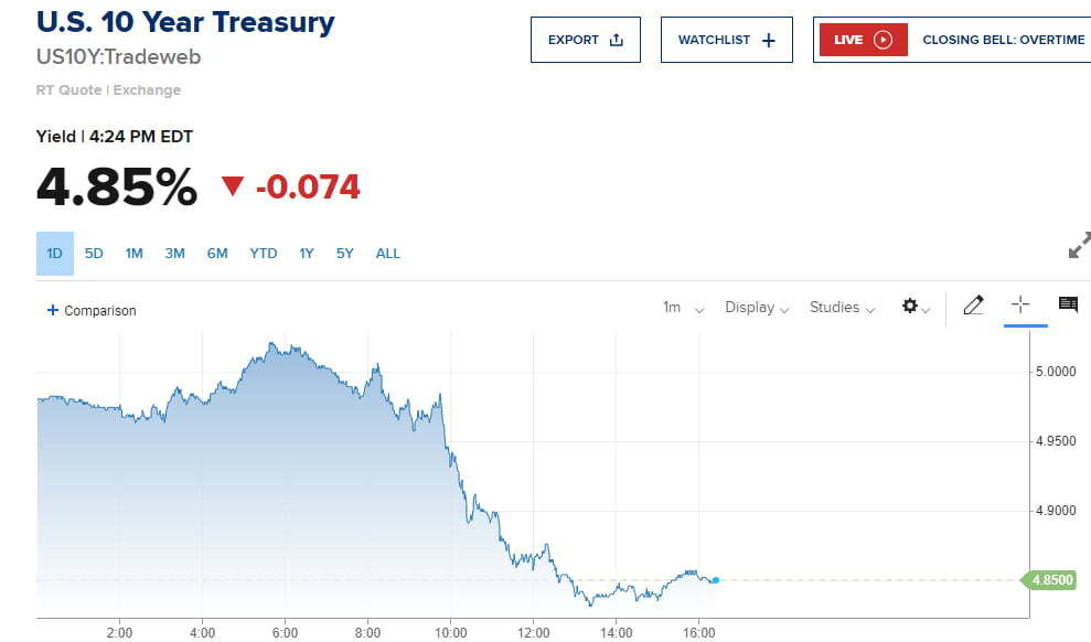 10년물 금리가 5%까지 치솟자 뉴욕 증시의 주요 지수는 아침 9시 30분 0.3% 수준의 하락세로 출발했습니다. 나스닥은 9시 45분께 1% 넘게 내리기도 했습니다. S&P500 지수는 지난 4거래일 연속 하락했습니다. 그런데 또다시 내림세로 출발한 것이죠.