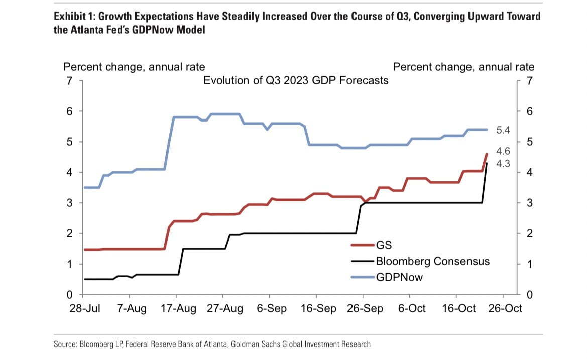 오는 목요일 3분기 GDP가 월가 컨센서스대로 4.3% 성장한 것으로 나온다면 경기 둔화 걱정은 사라질 수 있습니다. 게다가 더 높게 나올 위험이 큽니다. 애틀랜타 연방은행의 GDP나우는 5, 4%로 추정하고 있으며, 뱅크오브아메리카는 4.5%, 웰스파고는 5%를 예상합니다. 골드만삭스는 오늘 기존 4%를 4.6%로 끌어올렸습니다. 웰스파고는 "3분기 성장률은 미국 경제의 힘을 보여줄 것"이라면서 성장 요인별로 보면 개인소비지출은 연율 4.2% 급증해 2분기 0.8% 증가보다 눈에 띄게 증가할 것으로 봤습니다. 기업 설비투자는 2분기보다 소폭 감소한 것으로 추정했지만, 지식재산권 및 비주거용 건설 투자가 소폭 증가해 이를 상쇄할 것으로 예상했습니다. 또 주택 투자가 9분기 연속 위축됐지만 순 수출이 성장에 이바지할 것으로 기대했습니다. 웰스파고는 "종합하면 3분기 실질 GDP가 연율 5.0% 증가할 것으로 예상한다. 올해 경제 성장은 전년 대비 3.0% 증가할 것이며, 이는 팬데믹 이전 평균보다 약 0.5%포인트 높은 것"이라고 분석했습니다.