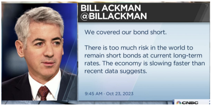 이유는 간단합니다. 월가의 유명 투자자 빌 애커먼이 트위터를 통해 "국채 공매도를 커버했다(We covered our bond short)"라고 밝힌 것입니다. 지난 8월 4일 "미 국채 30년물에 공매도 포지션을 취하고 있다"라고 밝힌 그가 이제 공매도를 정리했다는 것이죠. 그는 당시 "32조 달러의 연방정부 부채와 막대한 재정 적자 등으로 인해 국채 공급 증가는 보장되어 있다. 이를 Fed의 양적 긴축(QT)과 결합해보면 시장이 실질적으로 더 높은 금리 없이 공급의 큰 증가를 어떻게 흡수할 수 있을지 상상하기 어렵다"라고 공매도 이유를 설명했었습니다. 30년물 국채 수익률은 당시 4.2%에서 오늘 아침 한때 5.183%까지 치솟았습니다. 100bp가량 급등한 것이죠. 이렇게 두 달 이상 금리 상승(채권 가격 하락)으로 막대한 이익을 챙긴 애커먼이 포지션을 정리했다는 건 '금리 상승세가 끝났다'라는 신호일 수 있습니다. 애커먼은 공매도를 청산한 이유로 "지금 금리 수준에서 채권 공매도를 유지하는 것은 너무 위험이 많다. 최근 경제 지표가 보여주는 것보다 경제는 빠르게 둔화하고 있다"라고 밝혔습니다.
