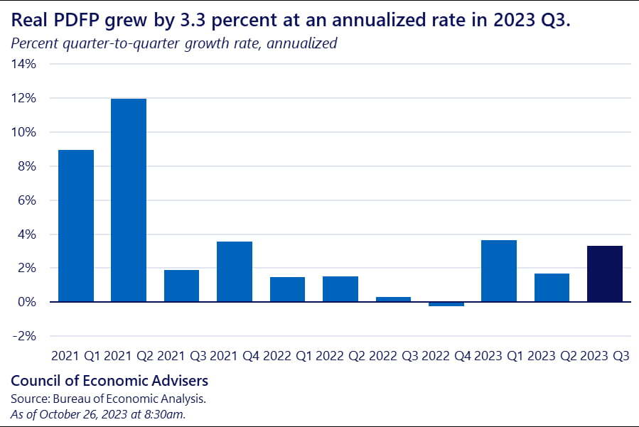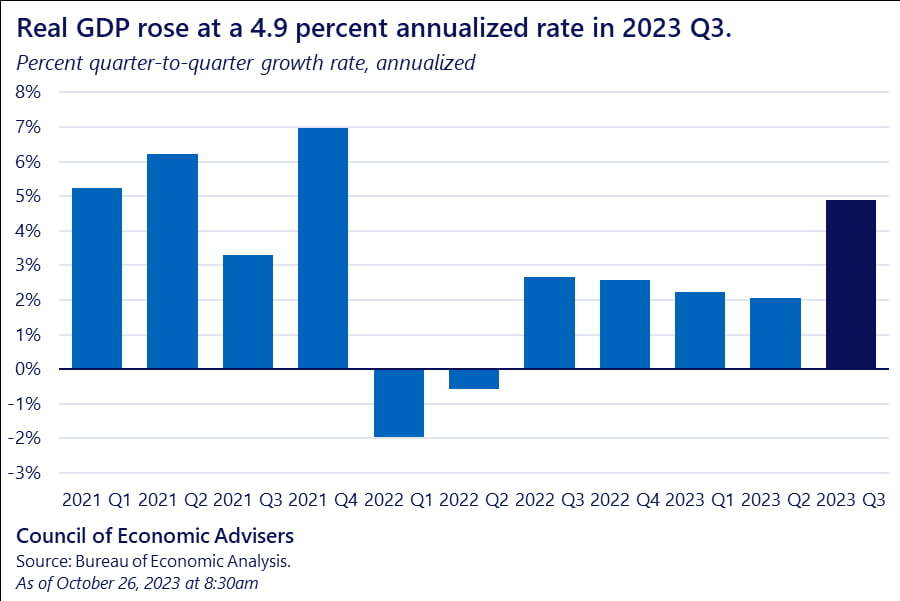 ▶3분기 국내총생산(GDP) 속보치는 월가 예상인 4.5%보다 높은 연율 4.9%로 집계됐습니다. 2분기 2.1%의 두 배 이상일 뿐 아니라 팬데믹 봉쇄가 풀리면서 경기가 튀어 오르던 021년 4분기 이후 가장 좋은 수치입니다.
