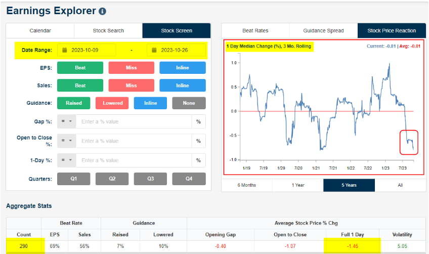 이런 실망감은 주가로 나타납니다. 베스포크 인베스트먼트에 따르면 이번 어닝시즌 들어 오늘 아침까지 기업 290곳이 3분기 실적을 내놓았는데 이들의 주가는 실적 발표 직후 하루 동안 평균 1.45% 하락했습니다. 베스포크는 "3분기 어닝시즌 들어 시장 전체가 약세를 보였음에도 불구하고 이는 매우 약한 수치다. 지난 3개월을 따지면 주가가 실적에 어떻게 반응하는지에 있어서 지난 20년 중 가장 약한 기간 중 하나였다"라고 설명했습니다.