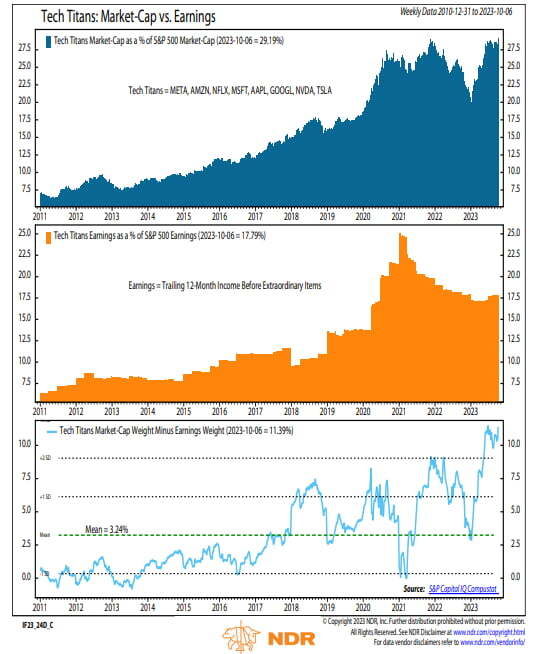 네드 데이비스 리서치의 에드 클리솔드 전략가는 "메가캡 기술주들은 S&P500 지수 시가총액의 29%, 이익의 18%를 차지한다. 11%포인트 격차는 기록에 가깝다. 기술주가 향후 상승은 물론이고 지금까지 랠리를 정당화하려면 훌륭한 EPS를 지속해서 보여줘야 한다"라고 밝혔습니다.